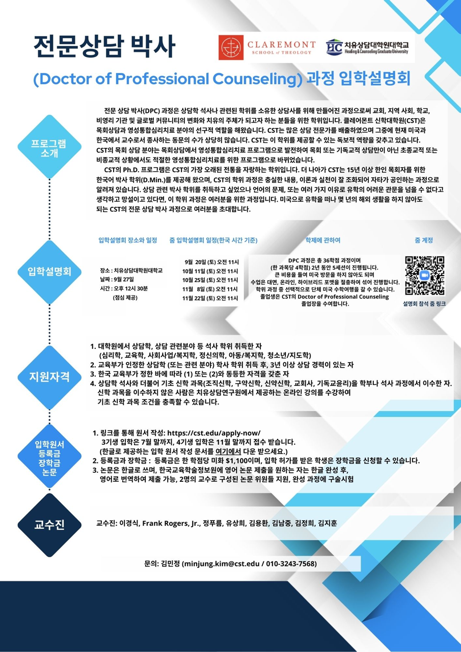 전문상담 박사(DPC) 과정은 상담학 석사나 관련된 학위를 소유한 상담사를 위해 만들어진 과정으로써 교회, 지역 사회, 학교, 비영리 기관 및 글로벌 커뮤니티의 변화와 치유의 주체가 되고자 하는 분들을 위한 학위입니다. 클레어몬트신학대학원(CST)은 목회상담 분야의 선구적 역할을 해왔습니다. CST는 많은 상담 전문가를 배출하였으며 그 중에 현재 미국과 한국에서 교수로서 종사하는 졸업생들의 수가 상당히 많습니다. CST는 이 학위를 제공할 수 있는 독보적 역량을 갖추고 있습니다. CST의 목회 상담 분야는 영성통합심리치료 프로그램으로 발전하였으며 CST의 Ph.D. 프로그램은 세계에서 가장 오래된 전통을 자랑하는 학위이고도 합니다. 더 나아가 CST는 15년 이상 한인 목회자를 위한 한국어 박사 학위(D.Min.)를 제공해 왔으며, CST의 학위 과정은 충실한 내용, 이론과 실천이 잘 조화되어 자타가 공인하는 과정으로 알려져 있습니다. 박사 학위를 취득하고 싶었으나 언어의 문제, 또는 여러 가지 다른 이유로 유학의 어려운 관문을 넘을 수 없는 분들이 많이 있습니다. 박사 학위를 취득하고 싶었으나 여러가지 이유로 망설이고 계신다면 이 학위 과정은 여러분을 위한 과정입니다. 미국으로 유학을 떠나 몇 년의 해외 생활을 하지 않아도 되는 CST의 전문상담 박사 과정으로 여러분을 초대합니다.
