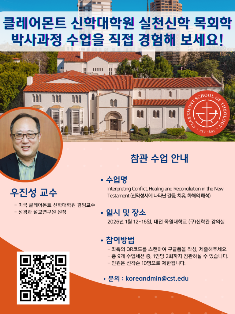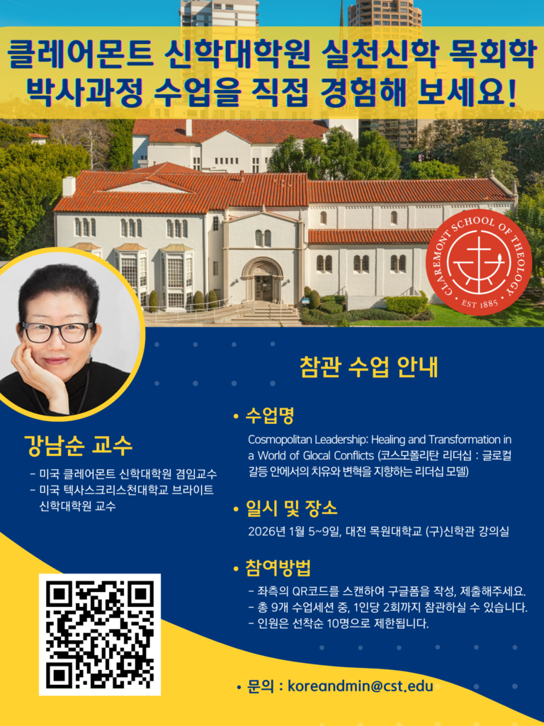 2026년 1월 5일(월)–9일(금), 1월 12일(월)-16(금)에 각각 진행되는 클레어몬트 신학대학원 실천신학(목회학 박사과정, DMin) 집중 수업의 참관을 희망하시는 분들께서는 아래 포스터의 안내를 확인하신 후 구글 양식서를 작성해 주시기 바랍니다. 신청 내용을 검토한 뒤 개별적으로 안내드릴 예정입니다.